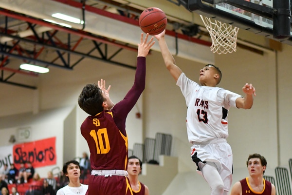 Luke Rwambuya of New Canaan blocks a shot by Paul Fabbri of St. Joseph. Dave Ruden February 13, 2019 Leave a Comment