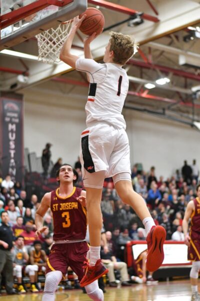 New Canaan’s Matthew Brand scores on a lob pass.