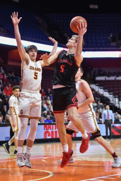 New Canaan’s Alex Gibbons puts up a shot in the paint.