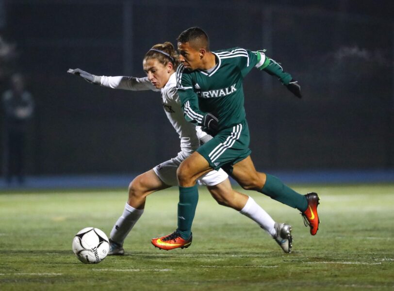 Norwalk’s Michael Hidalgo battles for the ball with a Naugatuck defender.