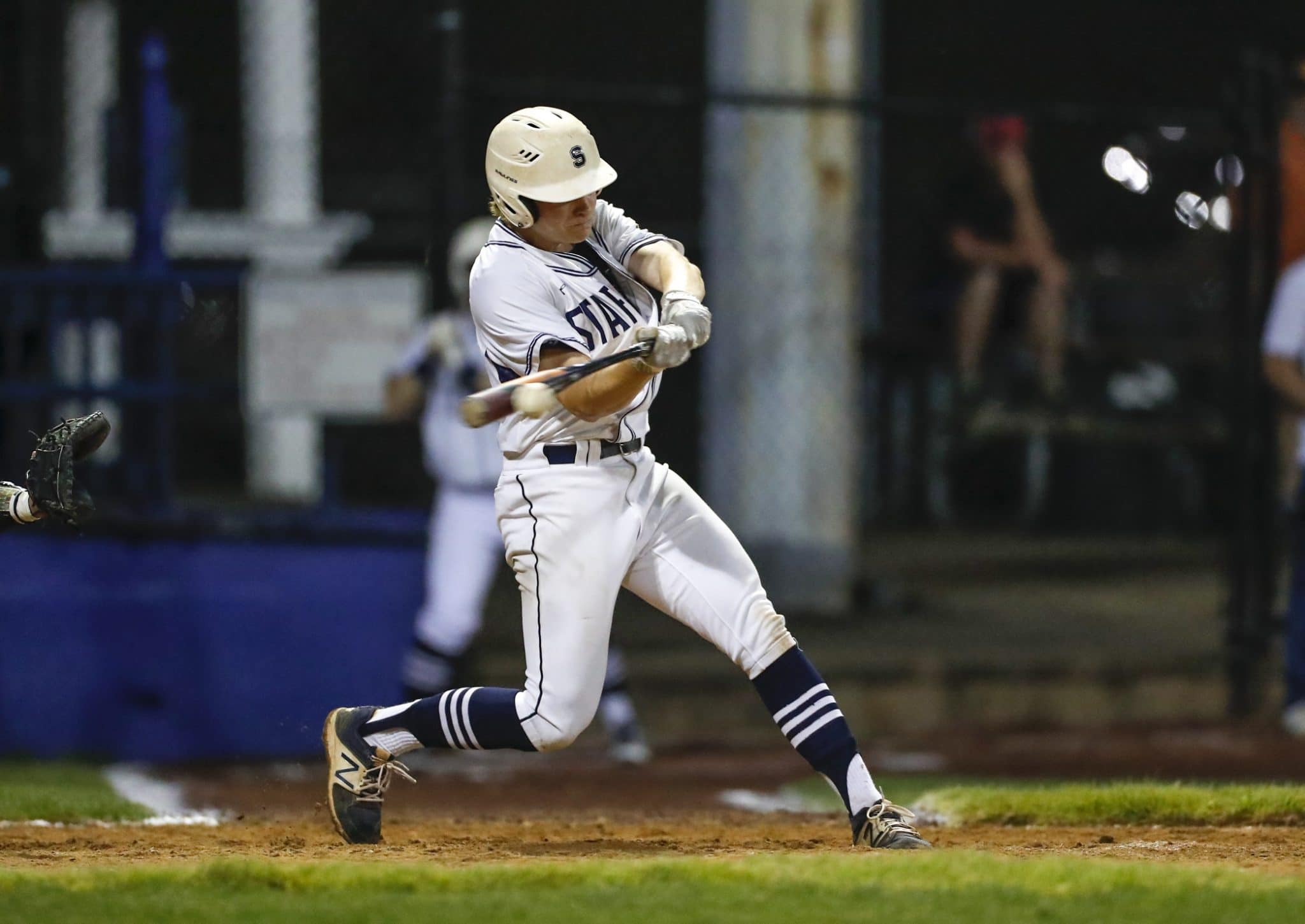 Staples’s Harris Azadian makes contact and reaches on an error. Dave Ruden May 23, 2018 Leave a Comment