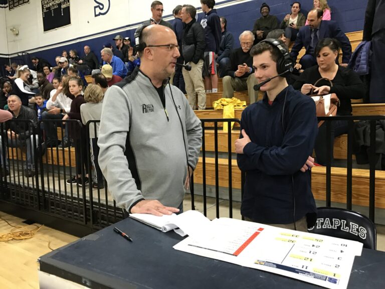 Cooper Boardman interviews me during a Staples boys basketball broadcast.