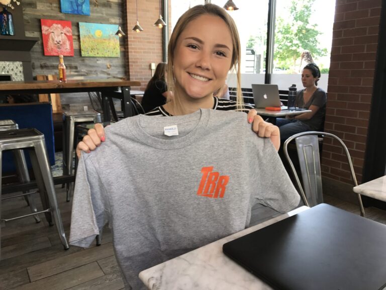 Natalie Brassinga displays the first shirts with her new TRR logo.