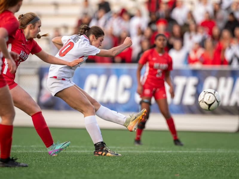 New Canaan’s Clare Greisen fires a shot on goal. (David G. Whitham) Dave Ruden November 17, 2024 Leave a Comment