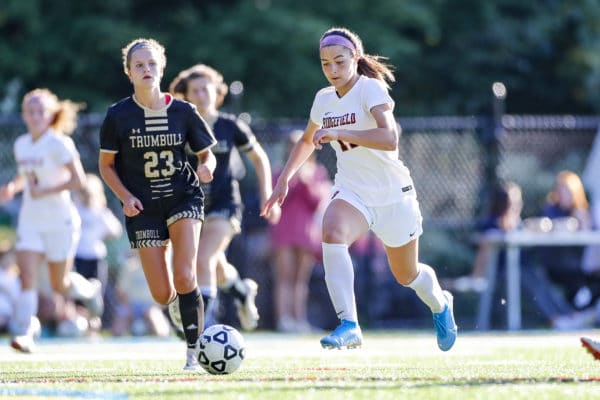 Trumbull’s Lauren Mecca hustles for a loose ball. (Matt Dewkett)