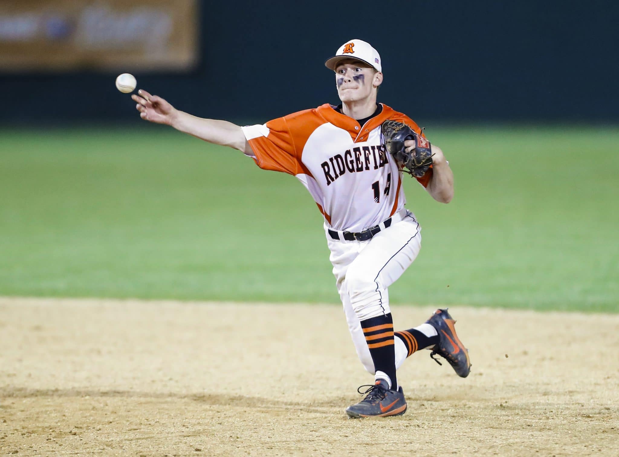 Ridgefield’s Matt Stamatis throws out a runner at first.