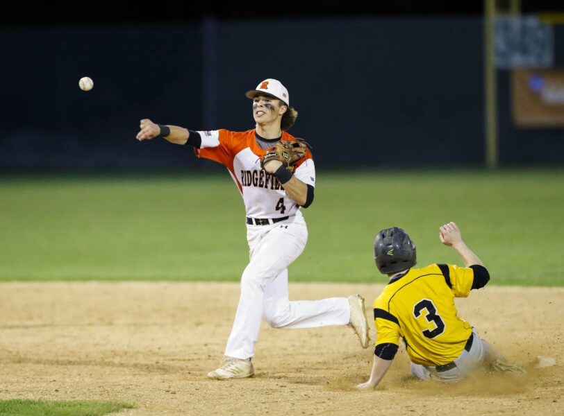 Ridgefield’s Quinn McDonald tries to turn a double play.