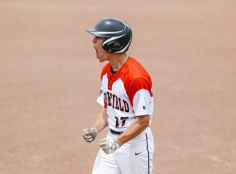 Ridgefield’s Matt Restive celebrates reaching base safely.