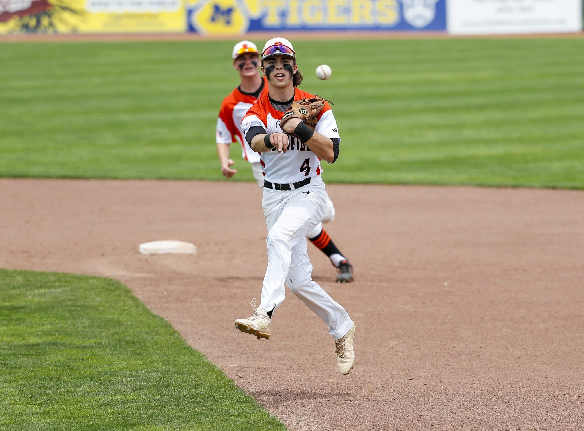 Ridgefield’s Quinn McDonald throws a runner out at first.