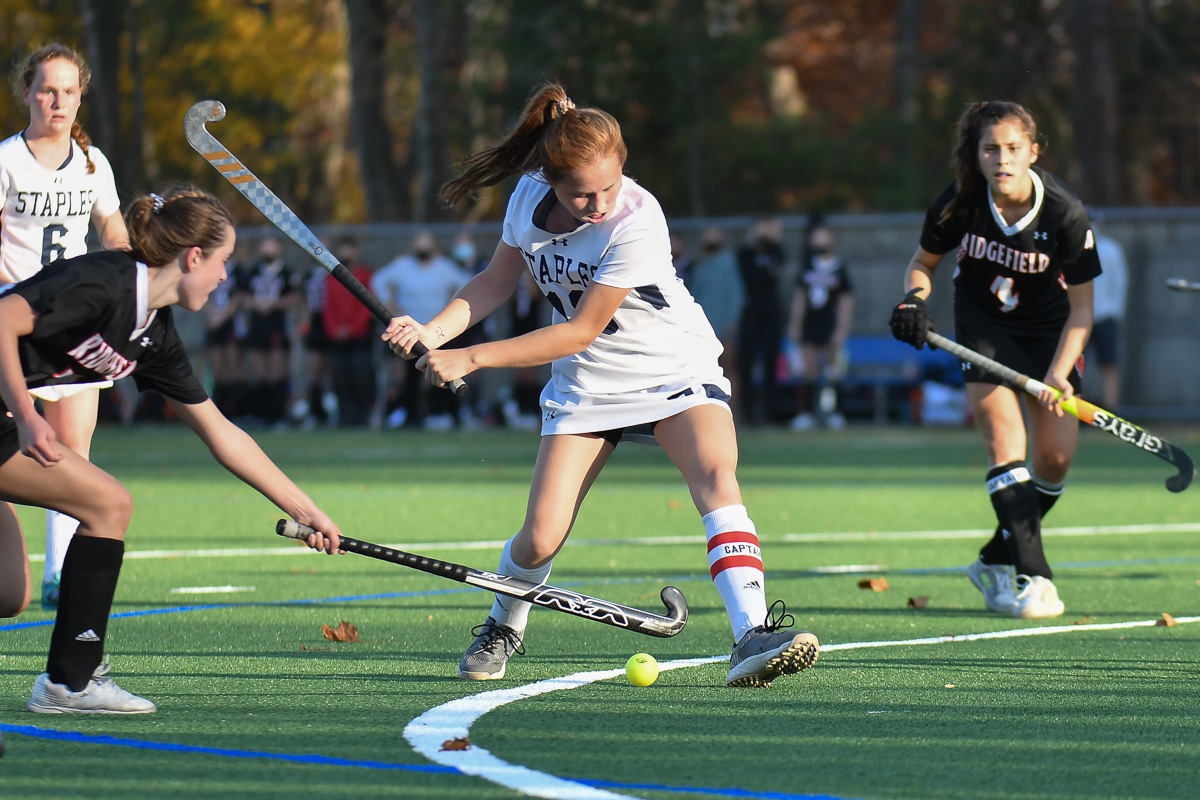 Madelaine Ambrose of Staples takes a shot against Ridgefield.