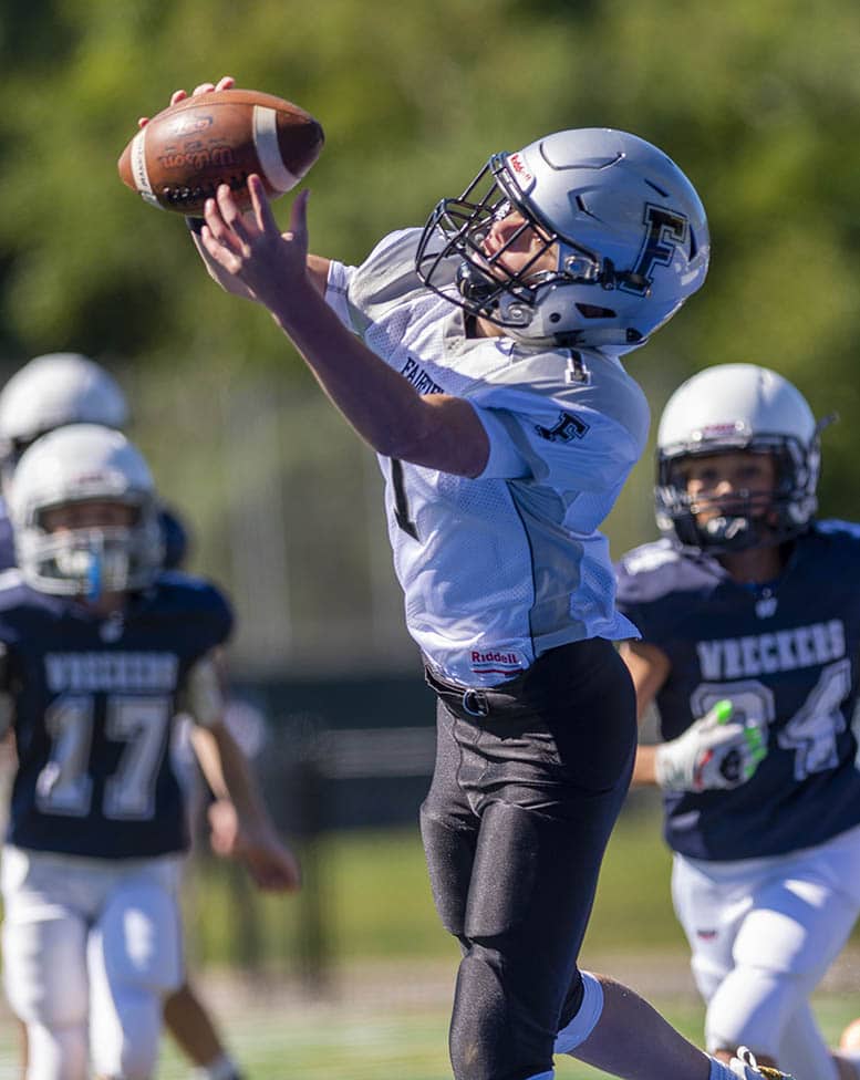 Fairfield Silver’s Crew Davis makes a nice catch during a 25-0 win over Westport North in a 7th Grade game. (Mark Conrad)