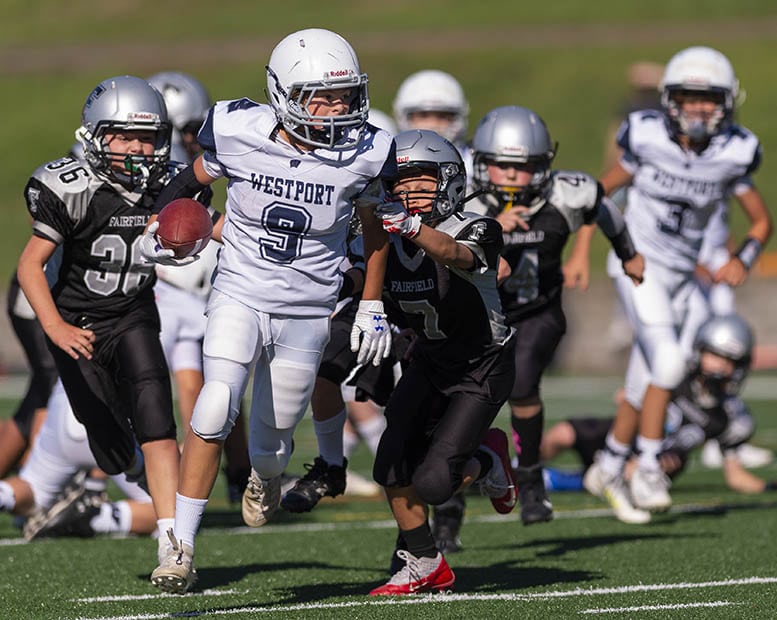 Fairfield Black won a hard fought battle over Westport North, 21-0, in a 6th grade game. Fairfield was led by its defense. Westport’s offense dominated the first half of play. Westport twice marched the ball deep into Fairfield territory. Fairfield stopped Westport on fourth down on the Fairfield 15-yard line in the first quarter.