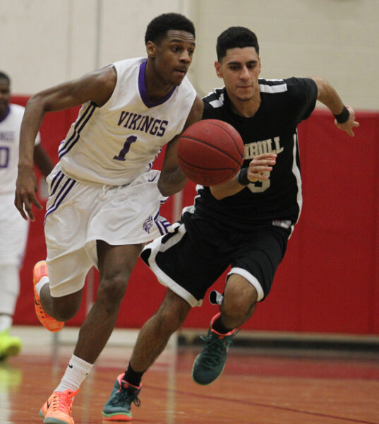 Westhill guard Jeremiah Livingston drives past a Ridgefield defender as Livingston ignited a fourth quarter fast break during FCIAC semi-final basketball action in Fairfield on Wednesday evening. Westhill, led by Livingston’s strong fourth quarter play, won the game, 68-61 to advance to the finals against Norwalk.