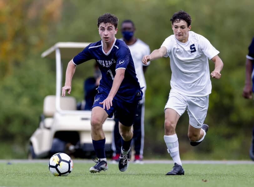 WiltonÕs Ross Edkins dribbles away from StaplesÕ Reese Watkins. Dave Ruden October 7, 2020 Leave a Comment