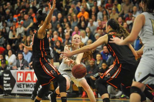 Taylor Brown (53) of the Trumbull Eagles makes pass in traffic. Dave Ruden February 23, 2017 Leave a Comment