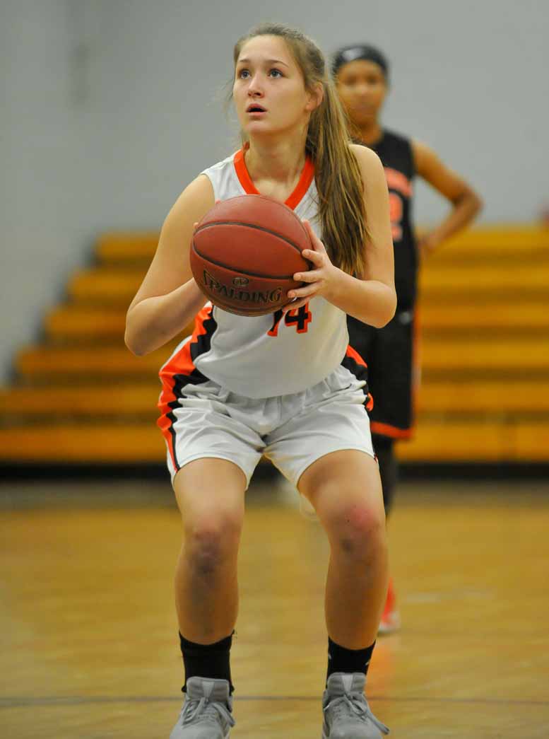 Karley Smith (14) of the Ridgefield Tigers shoots a free throw. Dave Ruden February 22, 2017 Leave a Comment