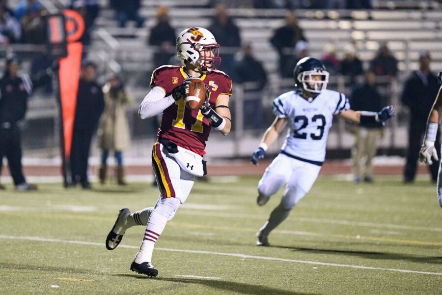 St. Joseph QB Jack Wallace looks to pass against Wilton High Dave Ruden December 4, 2019 Leave a Comment