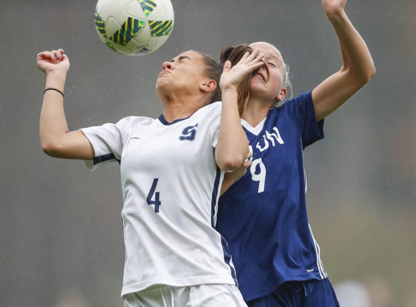Staples’ Haley Roraback and Wilton’s Piper Chase elevate for a 50/50 ball. Dave Ruden October 29, 2019 Leave a Comment