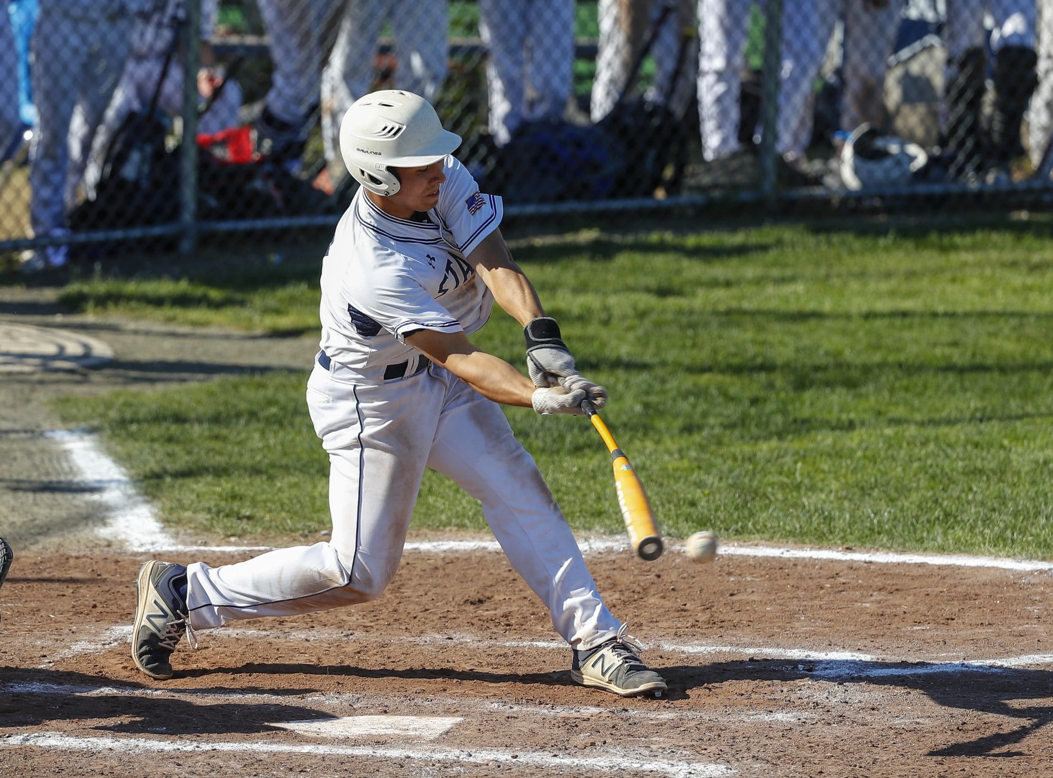 Staples’s Chad Knight’s bat flexes as he gets a base hit.