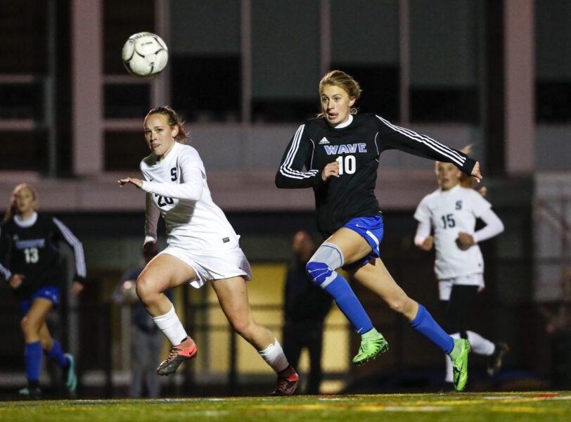 Darien’s Katie Ramsay chases down a ball against Staples’ Anne Amacker. Dave Ruden November 15, 2017 Leave a Comment