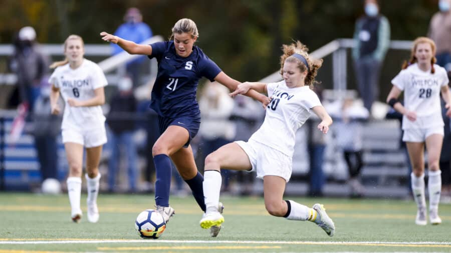 WiltonÕs Madeline Wecker tackles StaplesÕ Presley Sutter at midfield. Dave Ruden October 28, 2020 Leave a Comment