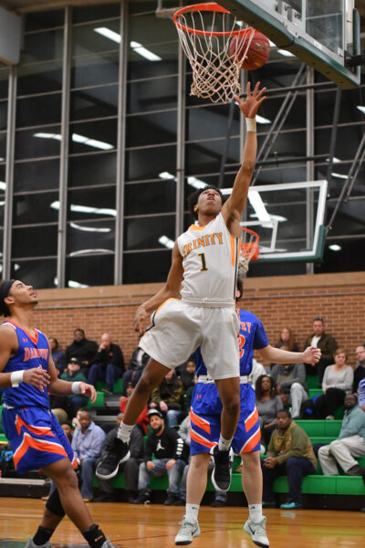 Trinity Catholic’s Stephon McGill drives for a lay up.