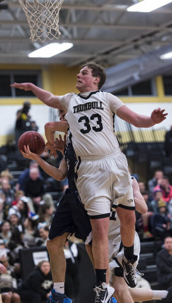 Trumbull high school’s Bennett Mccullough tries to block a shot by Wilton high school’s Richie Williams during a boys basketball game played at Trumbull high school, Trumbull, CT on Friday, January, 9th, 2015.