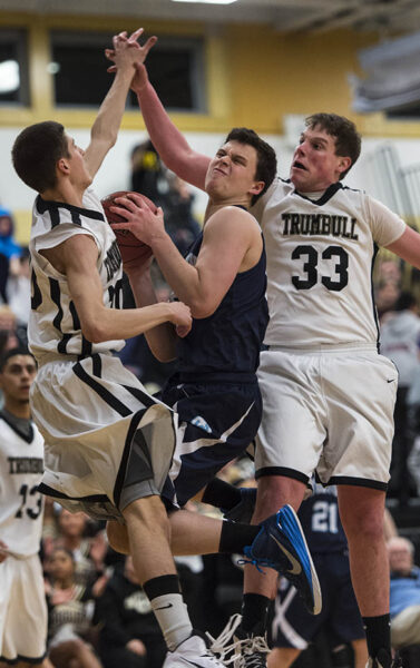 Wilton high school’s Lukey Savoie tries to go up for a shot as Trumbull high school’s Brandon Owen and Bennett Mccullough try to stop him during a boys basketball game played at Trumbull high school, Trumbull, CT on Friday, January, 9th, 2015.