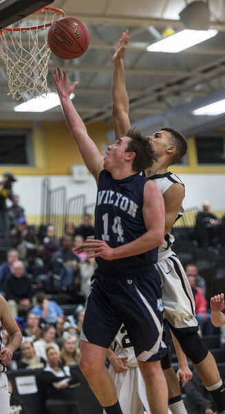 Wilton high schools Scott Shouvlin going up for a basket during a boys basketball game against Trumbull high school played at Trumbull high school, Trumbull, CT on Friday, January, 9th, 2015.