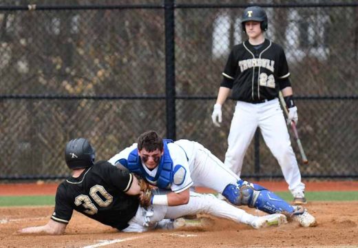 Robert Olah (30) of Trumbull is tagged out at home by Darien’s Sean O’Malley Dave Ruden April 12, 2017 Leave a Comment