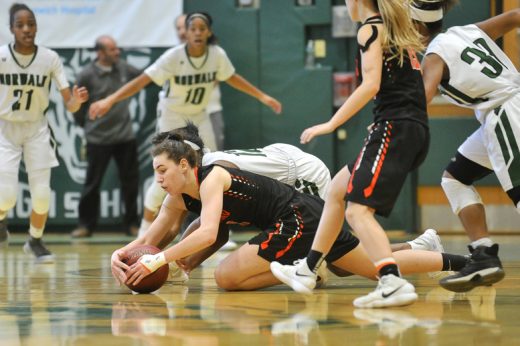 Stamford’s Andrea O’Connor goes to the floor to recover a loose ball. Dave Ruden February 17, 2018 Leave a Comment