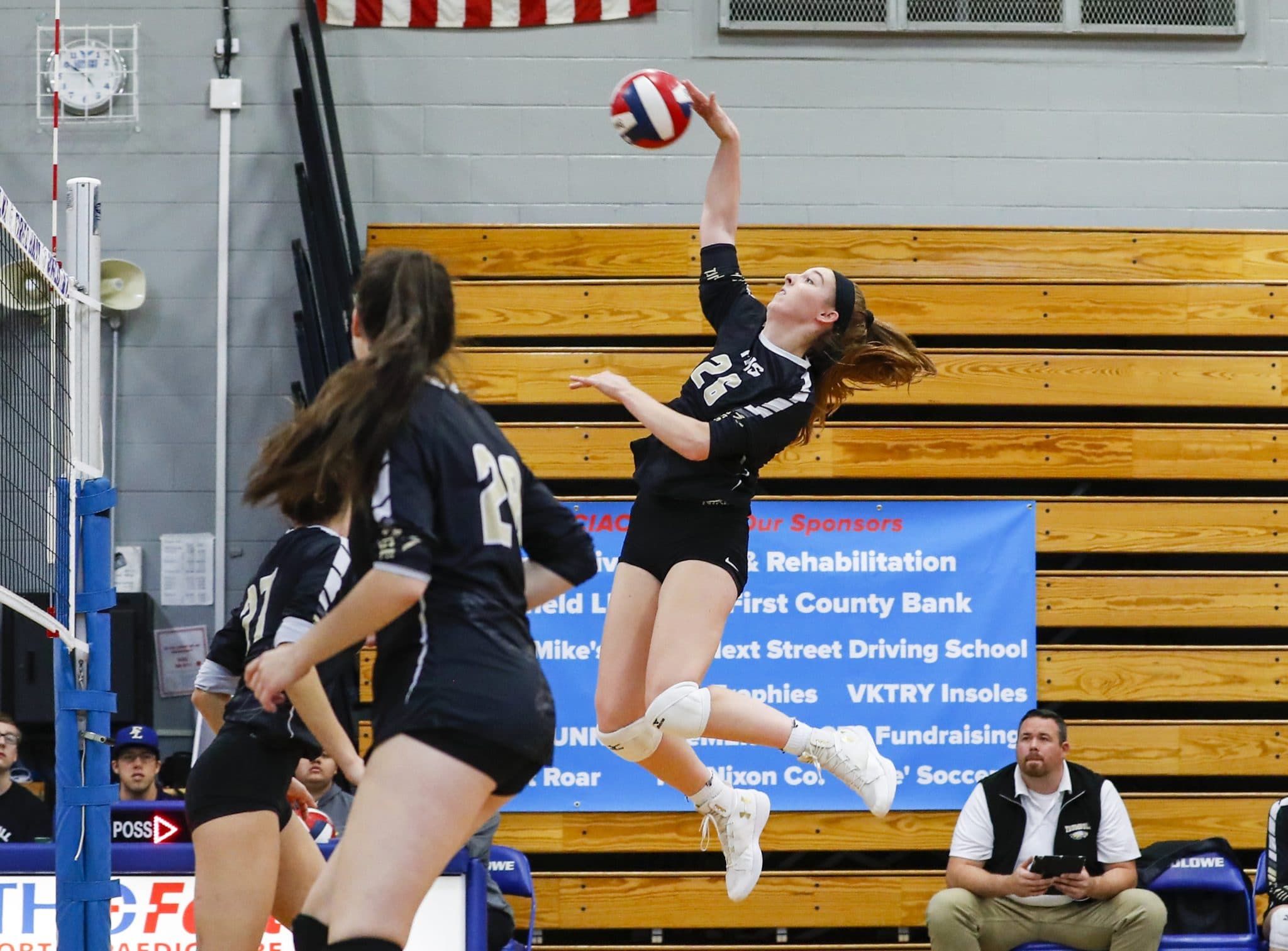 Trumbull’s Krystina Schueler gets some air to spike the ball. Dave Ruden November 3, 2018 Leave a Comment