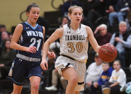 Allie Palmieri brings the ball up the floor for Trumbull. Dave Ruden February 5, 2018 Leave a Comment