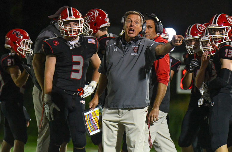 New Canaan Head Coach Lou Marinelli reacts to a call.