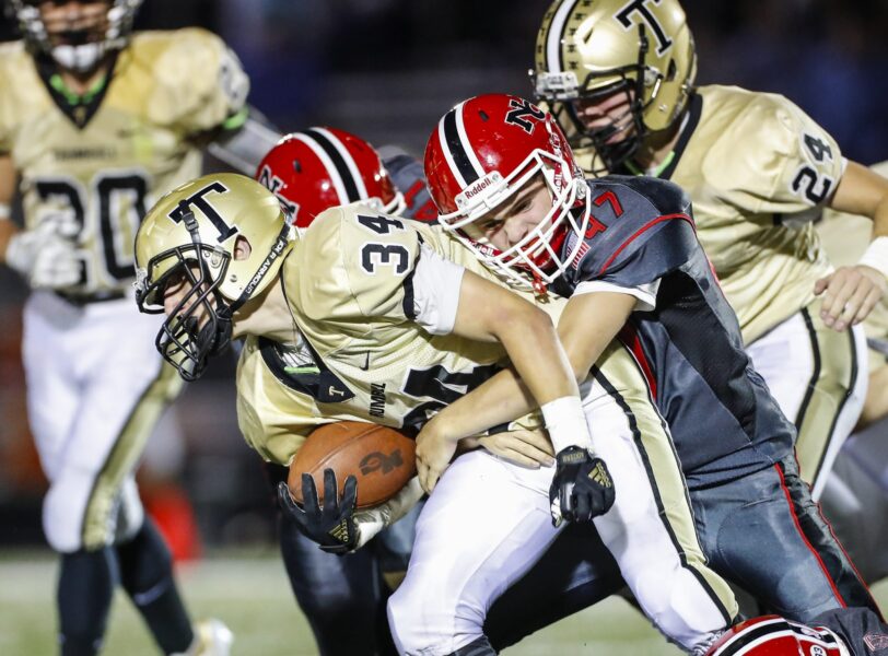 New Canaan’s Conor Mastey tackles Trumbull’s Corey Osborne. Dave Ruden September 26, 2017 Leave a Comment