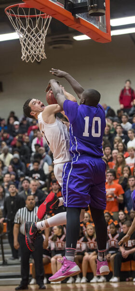 Westhill high school’s Tyrell Alexander tries to stop Stamford high school’s James Gronberg from getting a basket during a boys basketball game played at Stamford high school, Stamford, CT on Wednesday, December 7th, 2015.