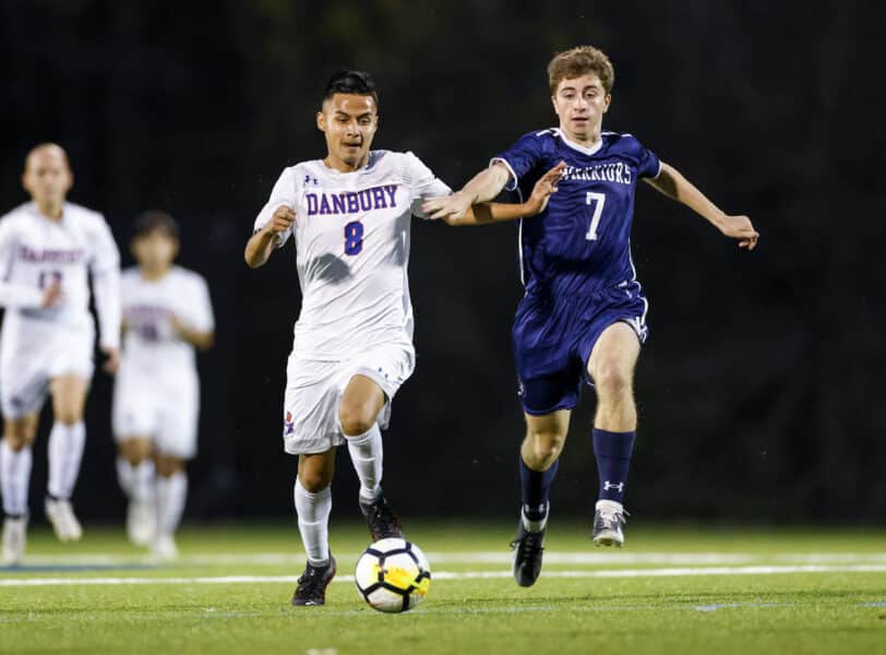 DanburyÕs Yeremi Danny Garcia and WiltonÕs Ross Edkins battle for the ball. Dave Ruden October 21, 2020 Leave a Comment