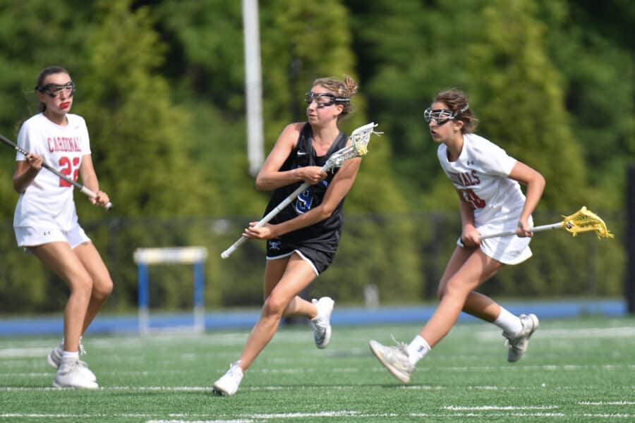 Ceci Stein carries the ball up field for the Blue Wave.