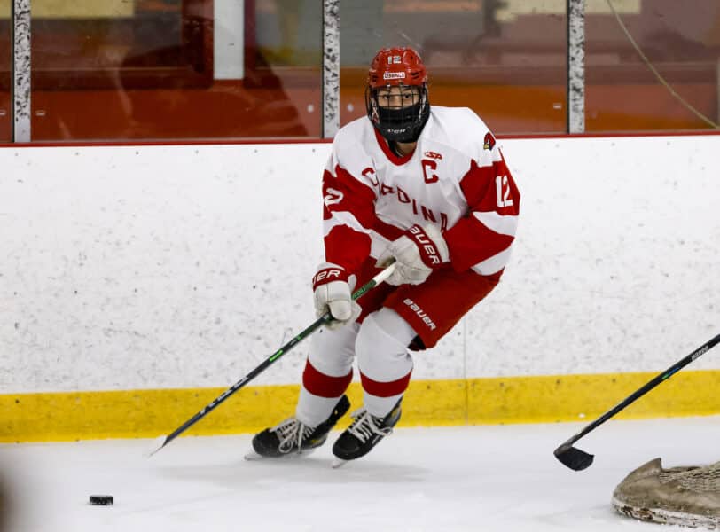 Greenwich’s Chris Cataldo skates the puck from behind his net. Dave Ruden February 24, 2021 Leave a Comment